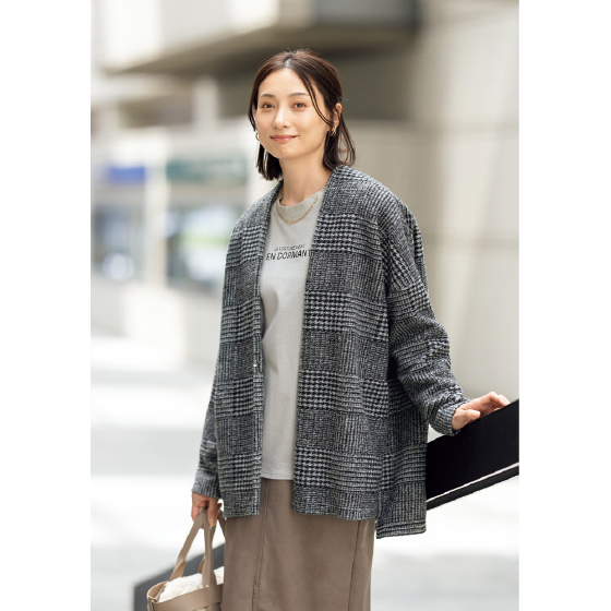 ふわっと空気を含む起毛素材だから、薄手なのに暖かさはたっぷり。1つホックでちょい着ができて、真冬はコートインでも活躍。