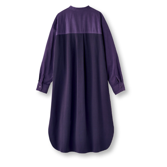 生地にカポック繊維を使用し、軽くてやわらかなコーデュロイに。すっきり見えるシルエットで、後ろ身頃はカットソー切替で軽やかな着心地です。
