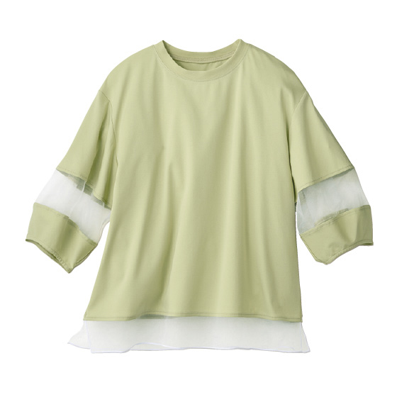 袖と裾のシアー切替が涼しげ。ボトムの上に着るだけで、インしたバランスに見えるカットソーです。体の線や二の腕カバーが叶うゆるシルエット。