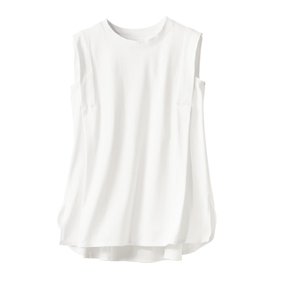 前振りのタックと後ろフレア、わきが見えにくい設計で360°きれい見え。接触冷感の綿100%カットソーで、着心地もサラッと涼やか。