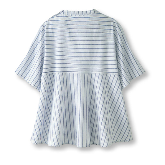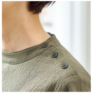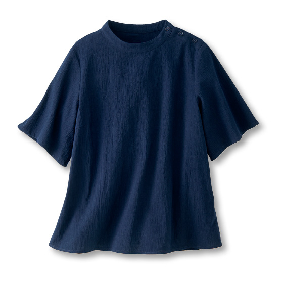 適度な厚さのコットン100%。ビンテージ加工で程よいシワ感を表現。低めのハイネックで首元すっきり。程よいフレア感で、体のラインを拾いにくい。