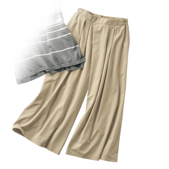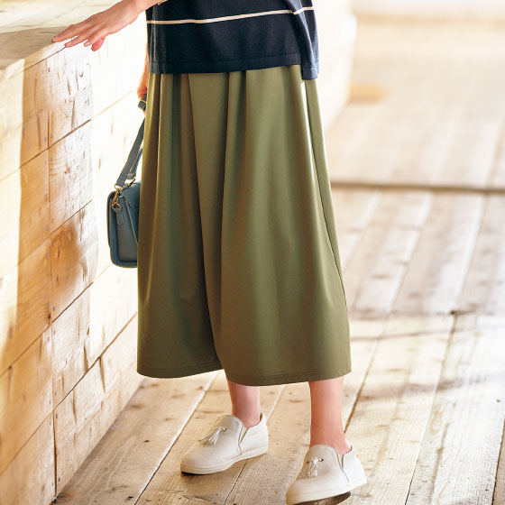 ウエストラップ風デザインでスカート見え。絶妙な落ち感とゆるシルエットで、肌にまとわりつかず暑い日でも心地よく過ごせます。※着用シーズンは夏秋です。