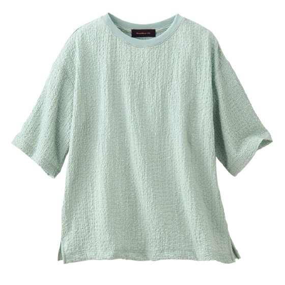 夏肌にさわやかな凹凸感のあるシャーリングジャカード仕立て。ゆるっとラクな身幅にすっきり丈でコーデしやすく、長めの袖が気になる二の腕もカバー。
