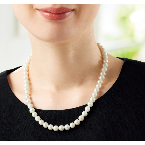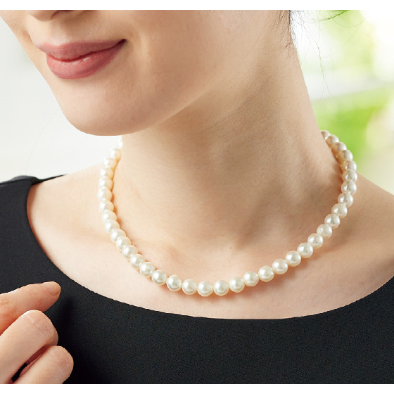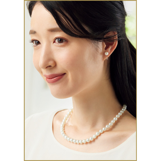本真珠の清楚で美しい照り、巻き、色合いが魅力。単品で、ふだん使いにもおすすめ。差し込み式で着脱簡単。