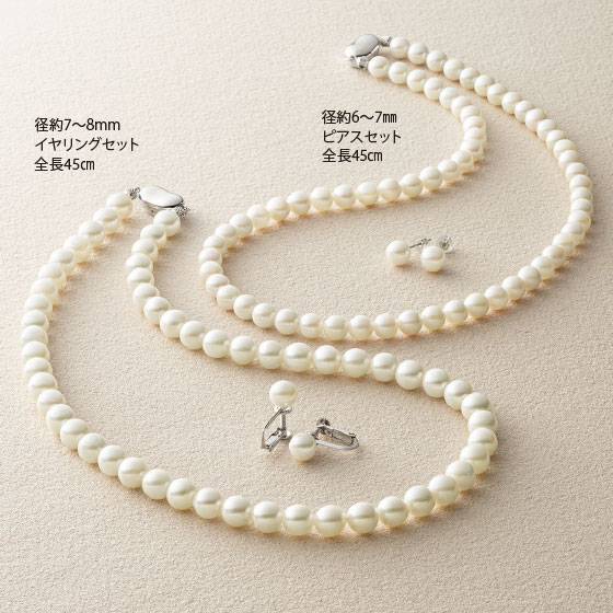 ●材質:あこや養殖真珠、留め具=ネックレス/シルバー925(ロジウムメッキ)、イヤリング/シルバー925(ロジウムメッキ)、ピアス/プラチナ900
