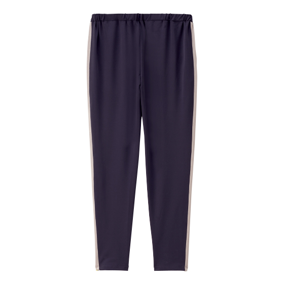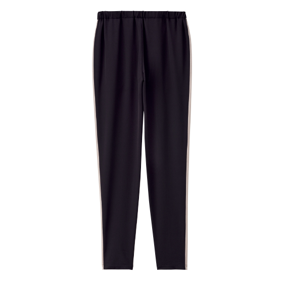 両サイドのラインでほっそり美脚見せ効果も。ウエストが調整できるスピンドル入り。両サイドにポケット付き。