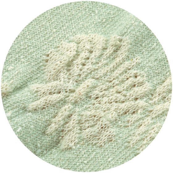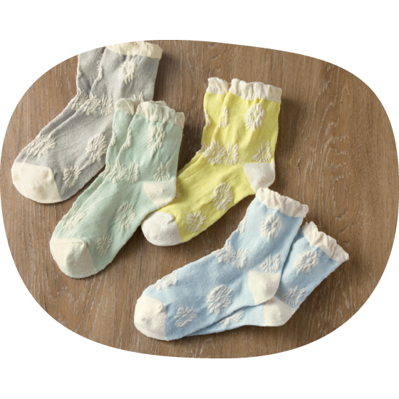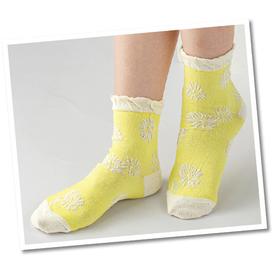 凹凸のある花柄がかわいいソックス。ゆったり仕様で窮屈感が少なく、肌側はシルク素材です。