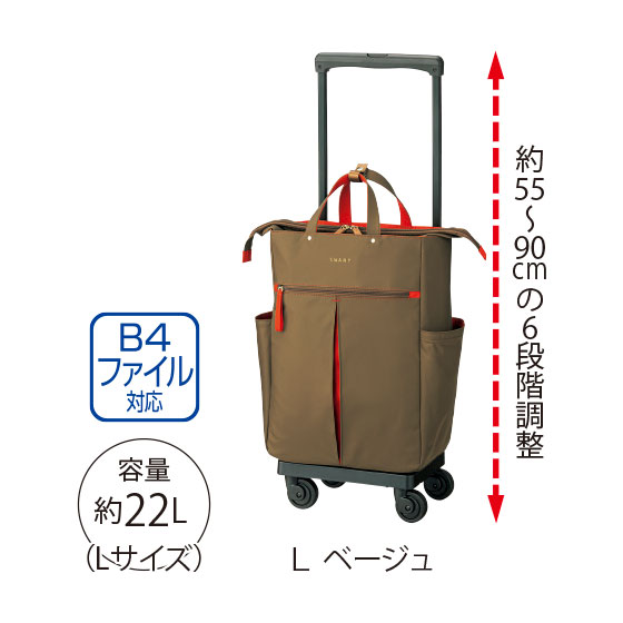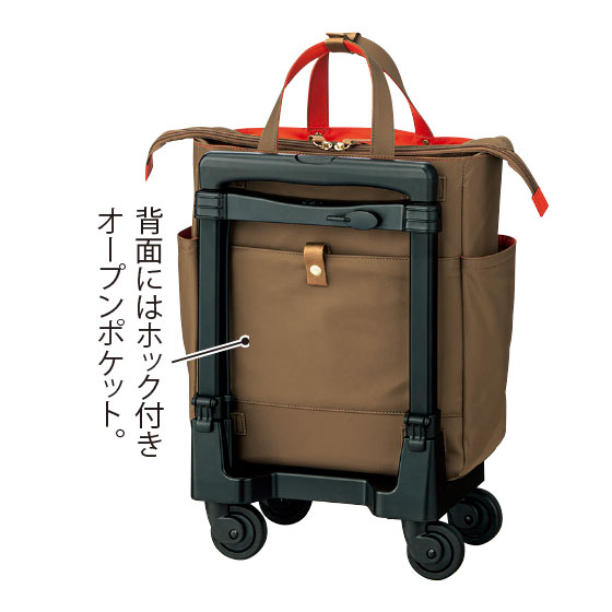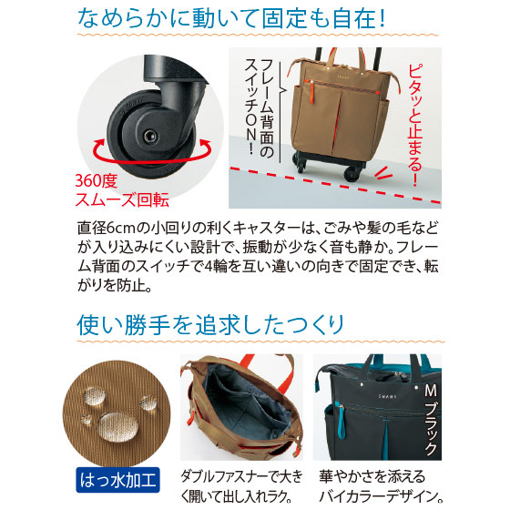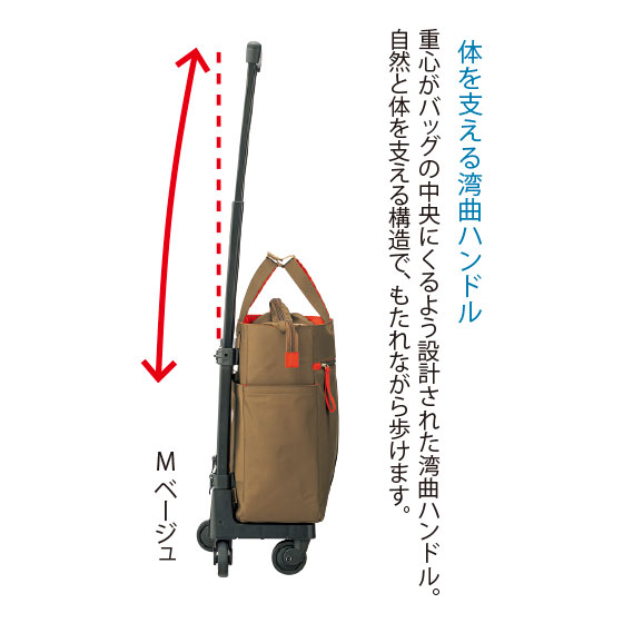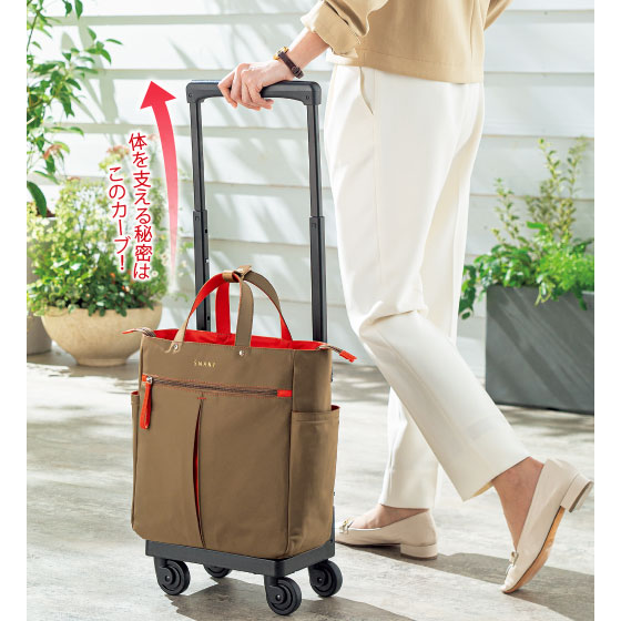 荷物を持たずに済むだけでなく、ハンドルにもたれながら押し歩ける人気のキャリーバッグ。独自の湾曲ハンドルは、脚に悩みを抱えるメーカー元会長の実体験をもとに開発されました。お買い物にも小旅行にもおすすめです。