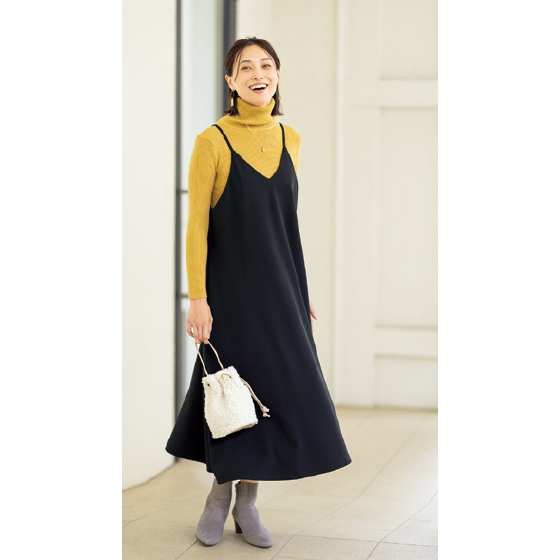 パターンの工夫と落ち感で、ラクに細見えワンピース。