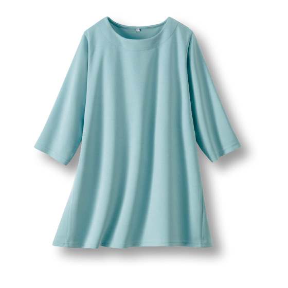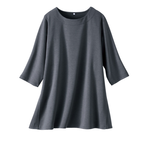 なめらかで、ほどよい厚みのあるダンボール生地。サイドに切替のあるフレアシルエットと、やや長めの袖丈で体形カバーも。