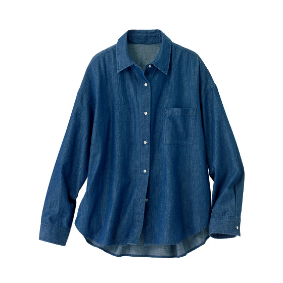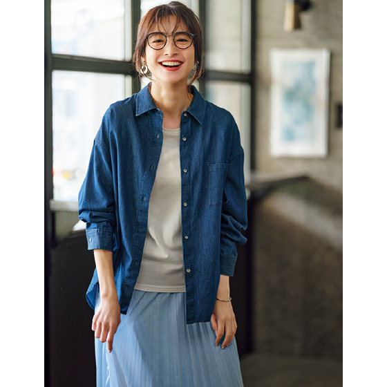 薄手のライトオンスデニム生地だからやわらかく、着心地も軽やか。ほどよくゆとりのあるシルエットなので、タートルニットなどをインすれば冬まで長く着回せます。