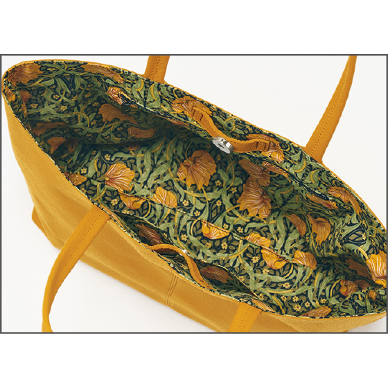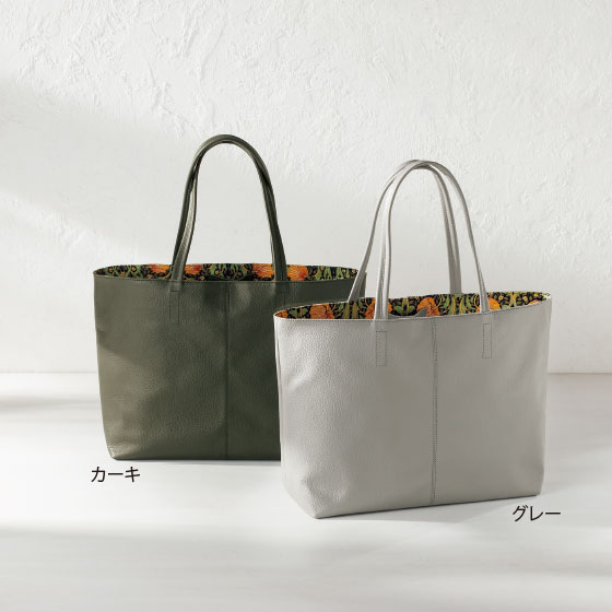 発色の美しさに定評のある姫路レザーと、裏地にウィリアム・モリスのテキスタイルを使用。やわらかな質感で体になじみやすいのが魅力。職人が国内で生産から仕上げまで行っています。