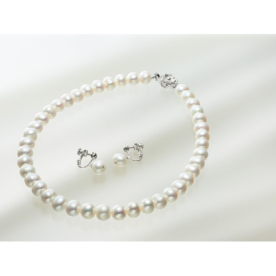 ●材質:淡水養殖真珠(10〜11mm珠・セミラウンド)、留め具=ネックレス/シルバー(ロジウムメッキ)、イヤリング/真鍮(代用ロジウムメッキ)、ピアス/チタン