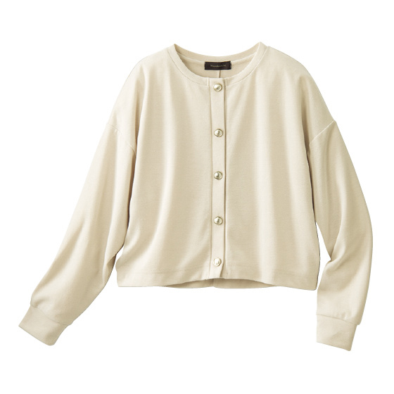適度な厚みのカットソー素材だから、着心地はカーディガン、見映えはジャケットのいいとこどり。短め丈でどんなボトムスにも合わせやすく、金色ボタンがさりげないアクセントに。堅苦しくないドロップ肩で着心地もラク。