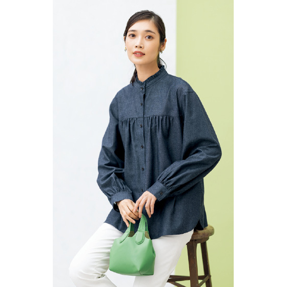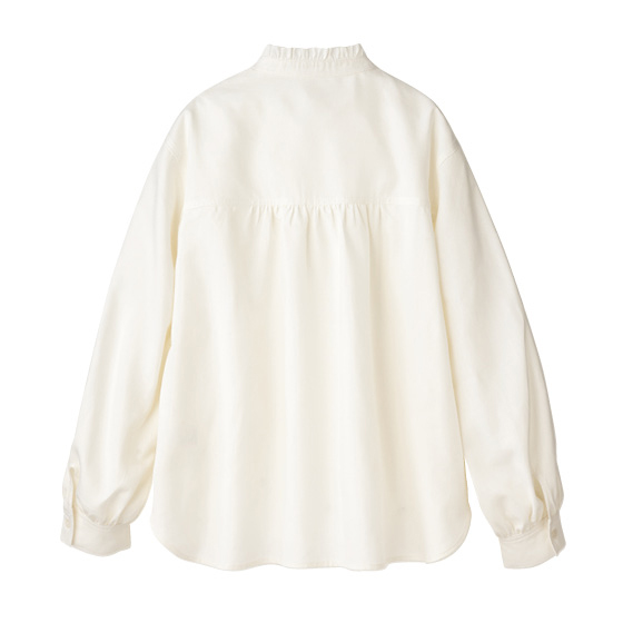 やわらかな風合いの綿混生地作ったブラウス。衿フリルや切替下のギャザーで大人フェミニンな印象に。シンプルすぎないので1枚で着ても華やぎ、重ね着にも活躍。