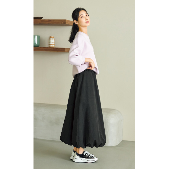 ウエストからヒップにかけてボリュームをおさえた、大人もはきやすいバルーンシルエット。裾の内側がゴム仕様で脚さばきもラク。はっ水加工で雨の日も重宝します。※通年着用できます。
