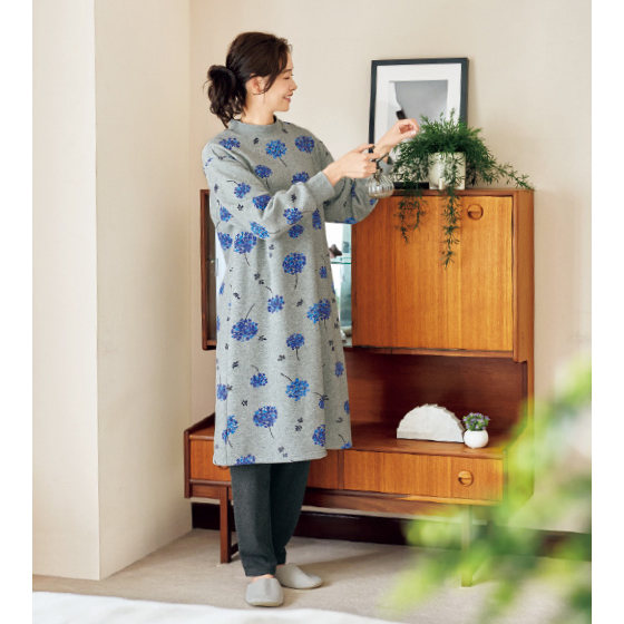 ふっくらソフトな綿混ニット素材を、裏起毛で暖かく。トップスはすとんと着てワンピ見え、パンツはすっきりシルエットで動きやすさも◎。