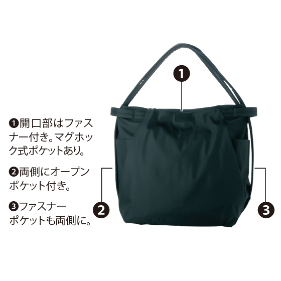 ●仕様:開閉=天ファスナー式、ポケット=外部にオープン式2個・ファスナー式3個・マグホック式1個、内部にオープン式3個・ファスナー式2個付き