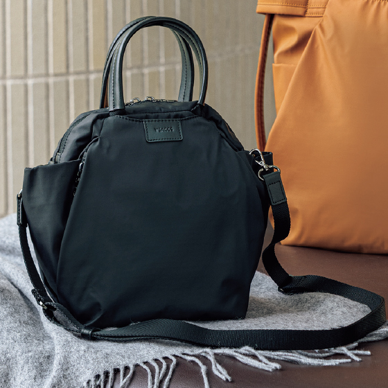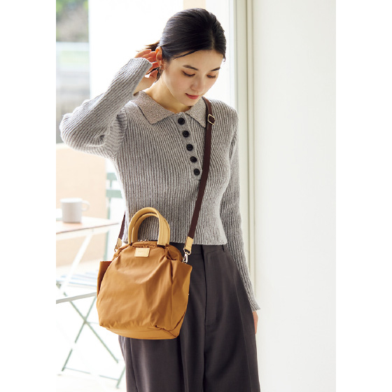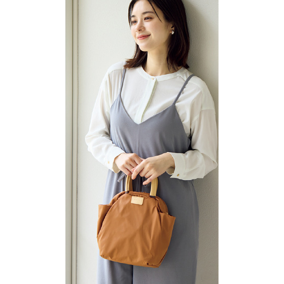 ショルダーを外して手持ちに。コンパクトで収納力も◎。マットな色合いが魅力。
