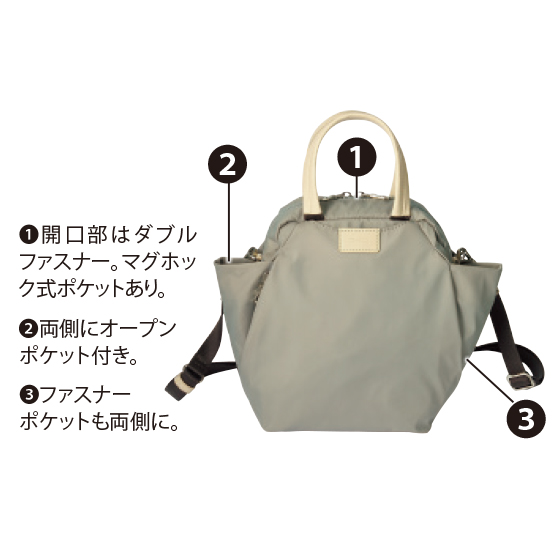 ●仕様:開閉=天ファスナー式、ポケット=外部にオープン式2個・ファスナー式2個・マグホック式1個、内部にオープン式1個・ファスナー式1個付き