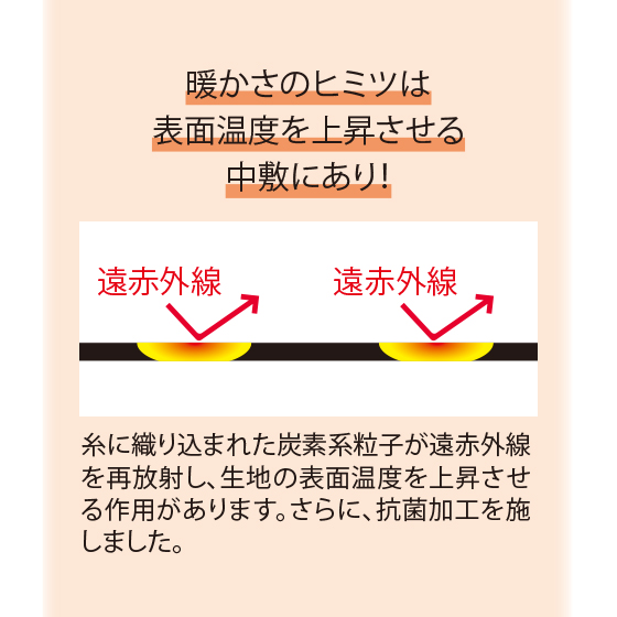 暖かさのヒミツは表面温度を上昇させる中敷にあり!糸に織り込まれた炭素系粒子が遠赤外線を再放射し、生地の表面温度を上昇させる作用があります。さらに、抗菌加工を施しました。