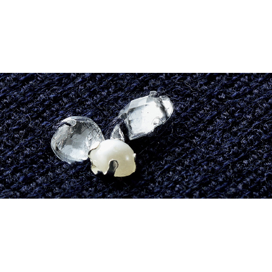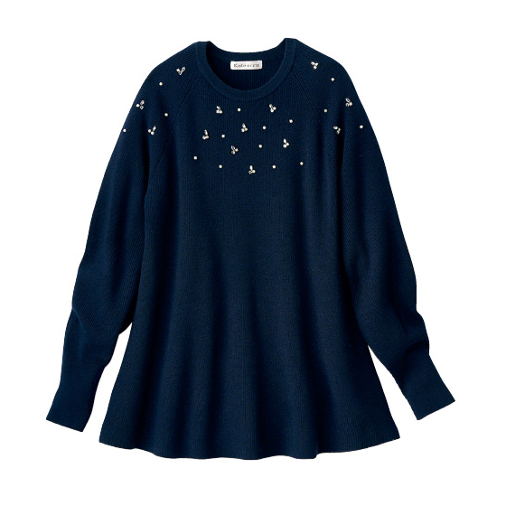 1枚でお出かけ感の出る映えニット。胸元に散りばめたビジューは、1粒使い&ブローチ風に3粒使いで華やか。背中はビジューなしでゴロつきにくい。