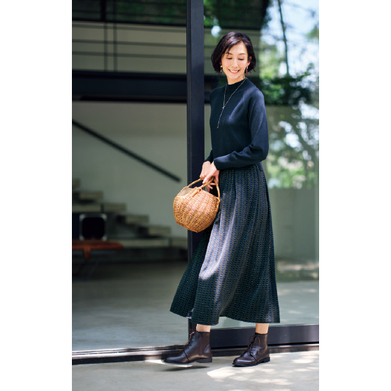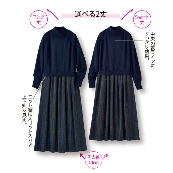 天竺ニットに、小紋柄のさらさらスカートが合体。悩まず時短でお出かけ支度ができるワンピです。ネイビー系には、きちんと感も映え感も。