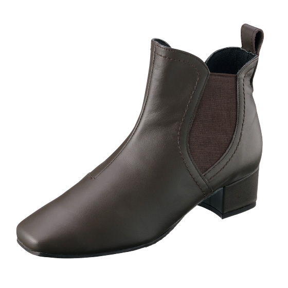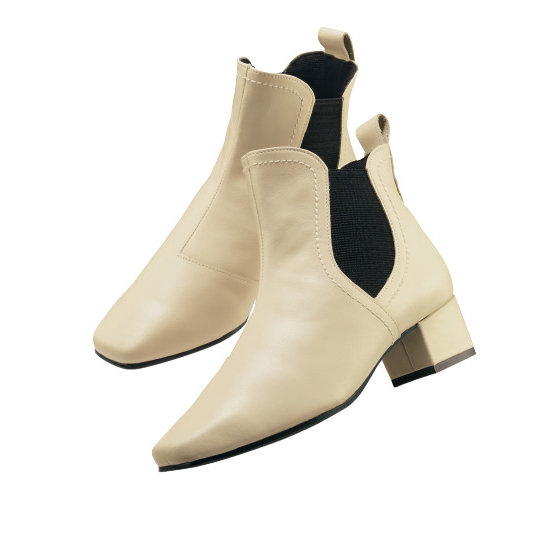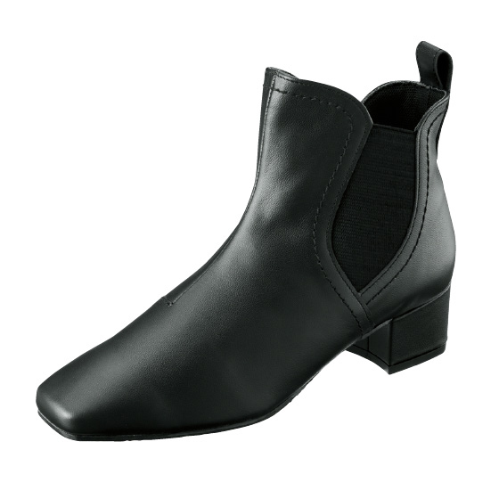 美発色のレザーと曲線カットのサイドゴアで、足元をきれいに見せるブーツです。太めヒールで十分な安定感。総丈:約14.5cm(かかとの高さを含む23.0cmの場合)。