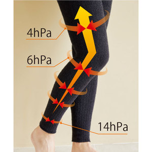 腰から太もも、足首へと少しずつ着圧が上がるよう編んでいるため、心地よい締め付け感。一日中むりなくはけて、動きやすい。