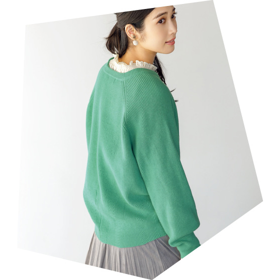 ふっくらやわらかなコットン混。背中側の裾の切替と編み地の工夫で丸みを出したコクーンシルエットのプルオーバーです。