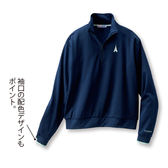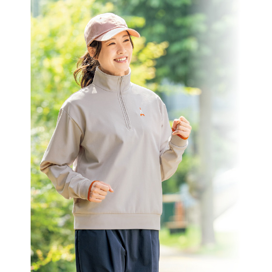 風合いの良い裏起毛素材のトップスは衿元まで暖かく、吸汗速乾機能付き。アクティブシーンだけでなくデイリー使いも。