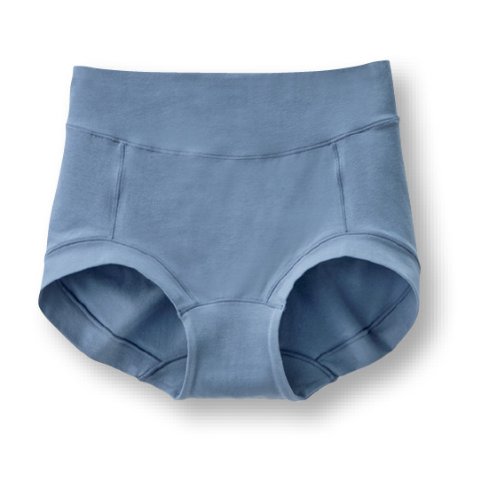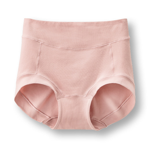 ウエストゴムを共生地で包み、肌に触れない仕様に。脚口は、折り返し仕様で締め付け感を軽減。