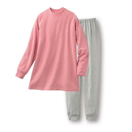 綿混裏起毛でふんわりやわらかな肌当たり。リブ仕様やラグランスリーブで動きもラクちんです。ゆるく立ち上がる衿、袖口、パンツ裾をリブで軽く絞り、スースーしにくく、暖かさをしっかりキープ。