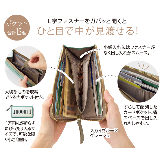 ●仕様:開閉=L字ファスナー式、ポケット=外部にオープン式2個、内部に小銭入れ1個・オープン式2個・カードポケット10個付き