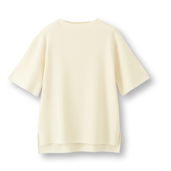 コットンアセテート混のドライタッチな素材。薄手でもしっかりした風合いの総針編み。体のラインもひろいにくく、1枚できれい見え。洗濯機で洗えて、汗ばむ夏も気持ちよく着られます。低めのモックネック。