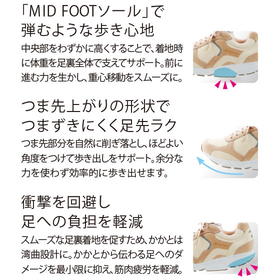 中央部をわずかに高くすることで、着地時に体重を足裏全体で支えてサポート。前に進む力を生かし、重心移動をスムーズに。つま先部分を自然に削ぎ落とし、ほどよい角度をつけて歩き出しをサポート。余分な力を使わず効率的に歩き出せます。スムーズな足裏着地を促すため、かかとは湾曲設計に。かかとから伝わる足へのダメージを最小限に抑え、筋肉疲労を軽減。