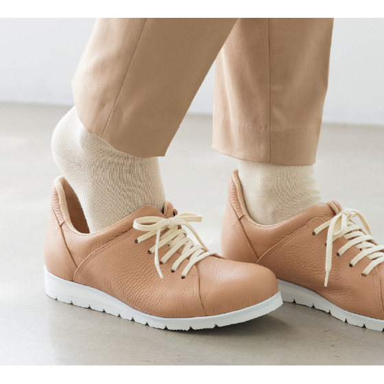 左右に開くベロ部分が大きな特徴。履くときにベロが足に巻き込まれにくく、甲部分からスルリと入ります。