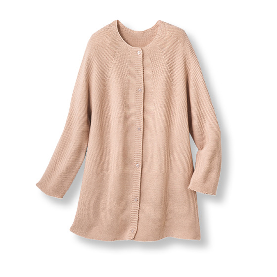 衿元から編み目が広がる求心編みで、肩回りをすっきり見せるニット。染色から編立まで日本製にこだわり、縫い目のないホールガーメント(R)製法で着心地も快適に。