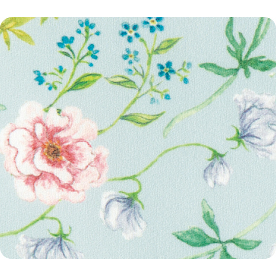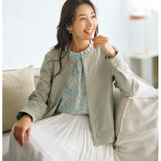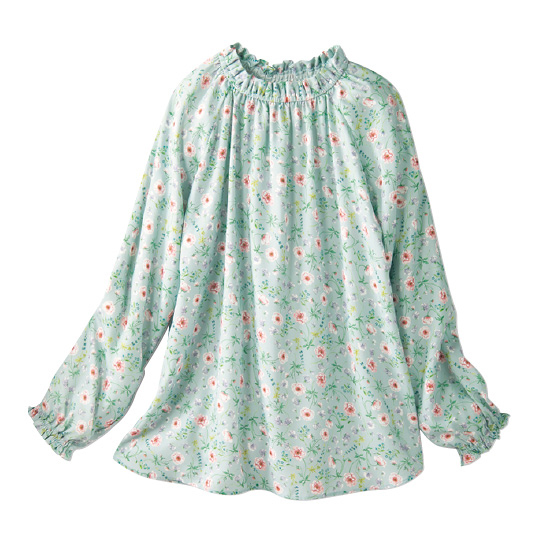 日比谷花壇のフローリストによる花柄を使用。衿と袖口のギャザーやフリルが華やかさを後押しし、ふんわり感で体形カバーも。