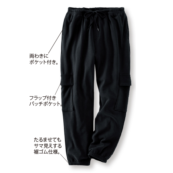 ストレッチ性があって動きやすく、きれい見えする綿混のカットソー素材を、はき心地はゆったり、見た目すっきりのカーゴパンツに。肌側は起毛でふんわり暖かです。ウエストは総ゴム&スピンドル仕様。※春秋冬、3シーズン着用できます。