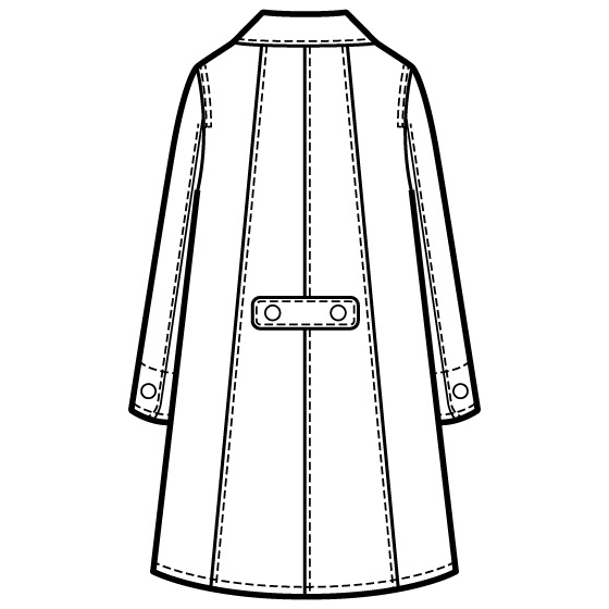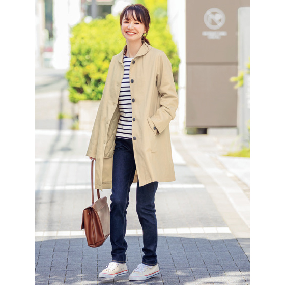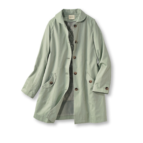 ラウンドした“チビ衿”と、ポケットのフラップがフェミニンな印象を与えてくれるステンカラーのAラインコート。前後の切替ステッチが効いたデザインは、細見え効果も。