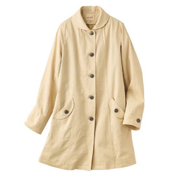 ラウンドした“チビ衿”と、ポケットのフラップがフェミニンな印象を与えてくれるステンカラーのAラインコート。前後の切替ステッチが効いたデザインは、細見え効果も。
