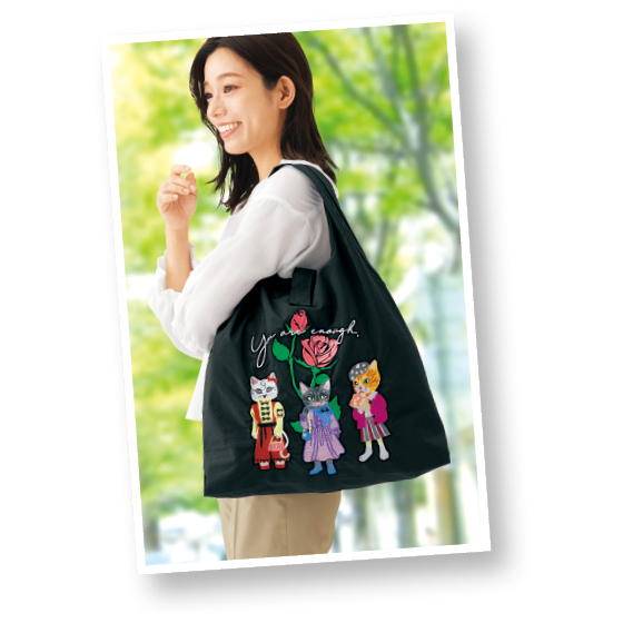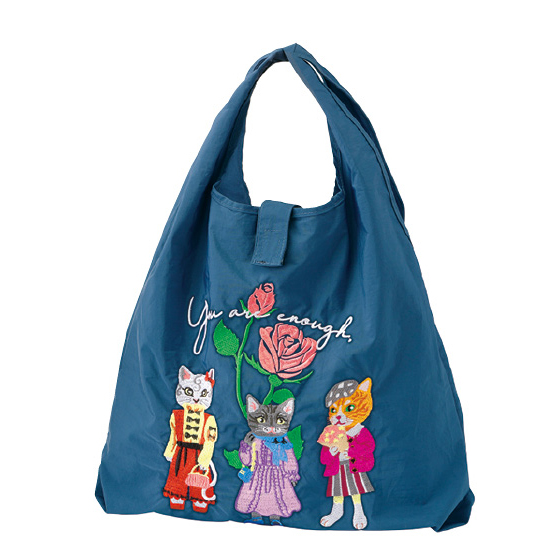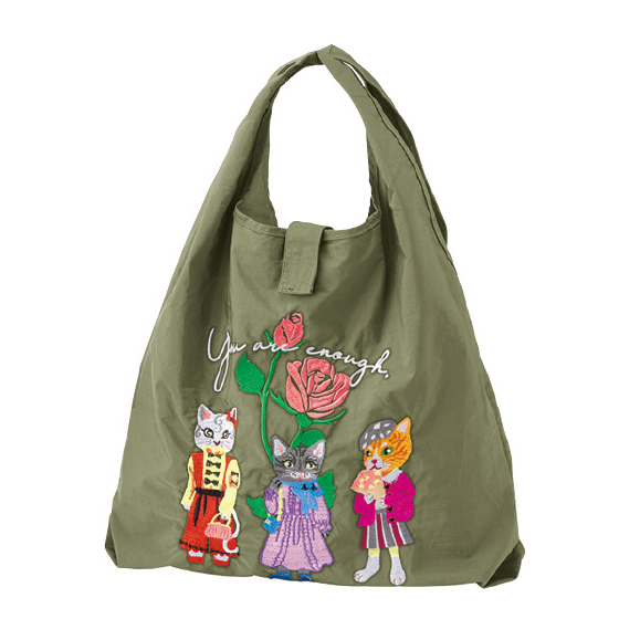 愛嬌のある猫たちを刺繍でデザイン。しっかりマチがあり、2Lペットボトル5本が入る大きめサイズです。肩掛けがラクな幅広の持ち手。