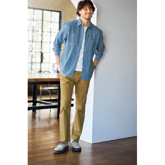 ●素材:綿74%・ポリエステル24%・ポリウレタン2%(織物、綾織・ヨコのび、製品洗い加工)