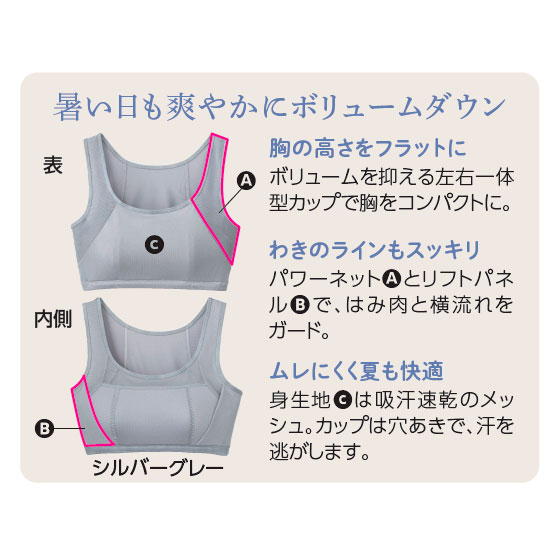 広めのアンダーゴムでバストを安定。背中の汗も吸ってサラリ快適。