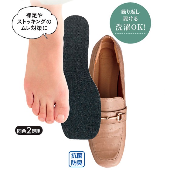足裏の汗を吸いとりつつ、サラッとムレにくい編み地で、抗菌防臭効果もあります。表面は靴下にも使われる素材。裏面はグリップ性があり、すべりにくい。