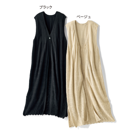 甘すぎない透かし編みで品よく決まるロングジレ。パンツコーデにはおるだけで抜け感のあるレイヤードが完成。