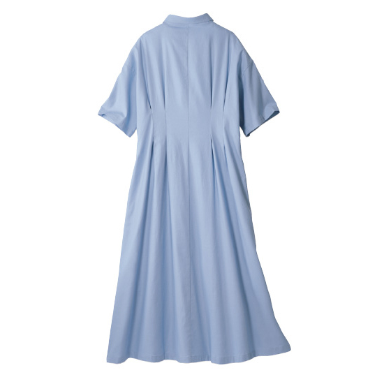 メリハリの効いたウエストのタック使いが印象的。きちんと感のあるシャツ衿デザインで、シーンを選ばず着られます。袖口はタブで丈感を調節可能。両わきにポケット付き。