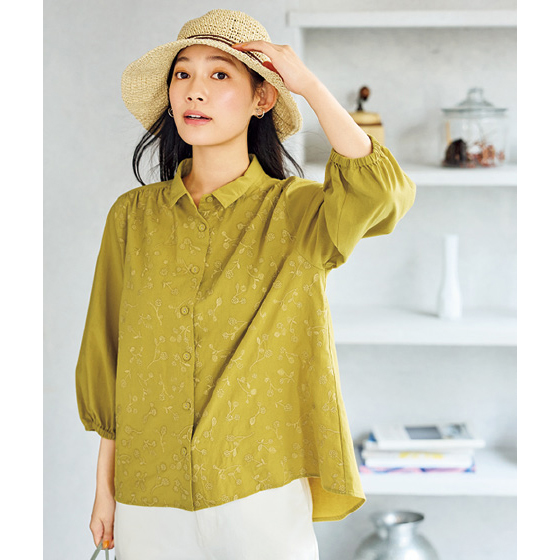 前身頃にあしらった刺繍は身生地と同色だからほどよいナチュラル感。7分袖で秋口まで長く着られます。