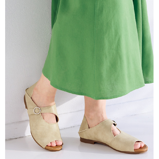 甲がほどよく隠れて、安心感のある履き心地。内側はフェルト素材でソフトな肌触り。かかとを踏んでサンダルとしても使えます。